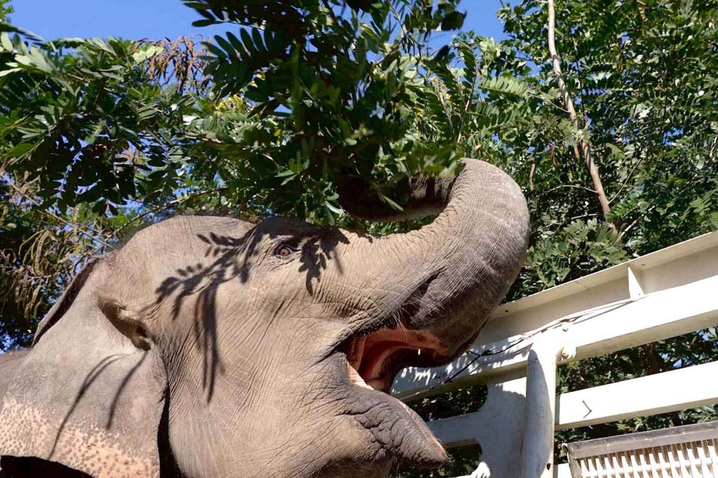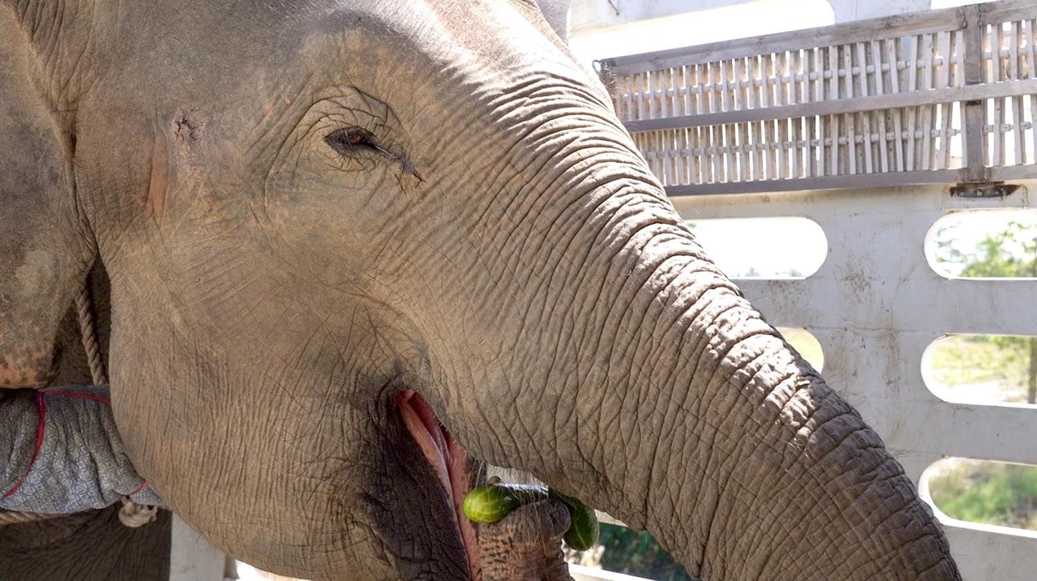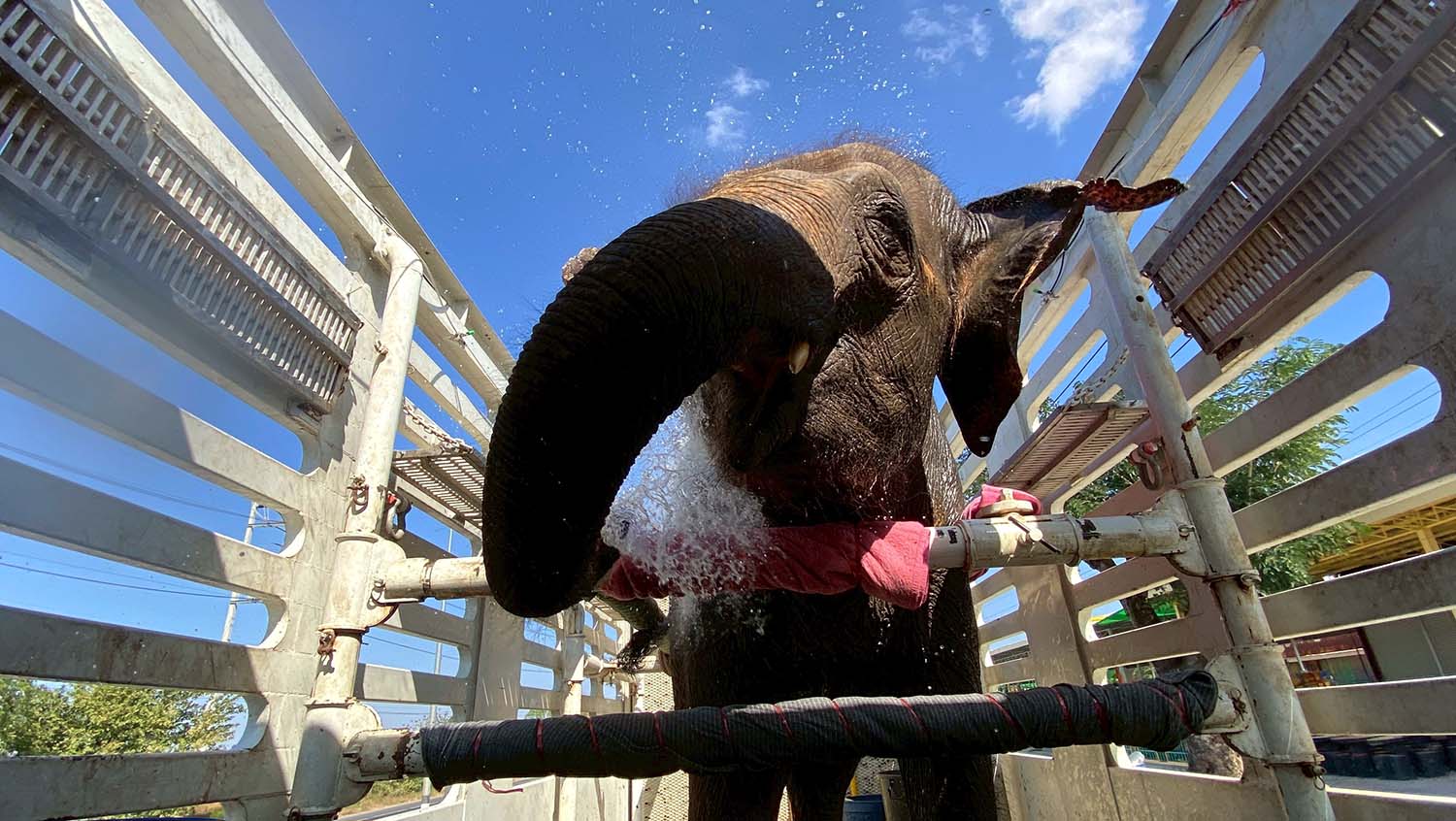 During the long overnight journey from Surin Province to the sanctuary in Mae Taeng, Chiang Mai Province, Nam Phueng was understandably anxious, but she was still able to spray herself with water and eat cucumbers and banana leaves along the way.