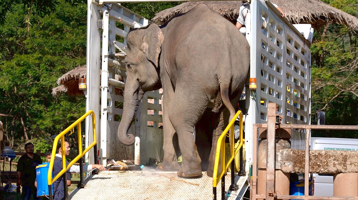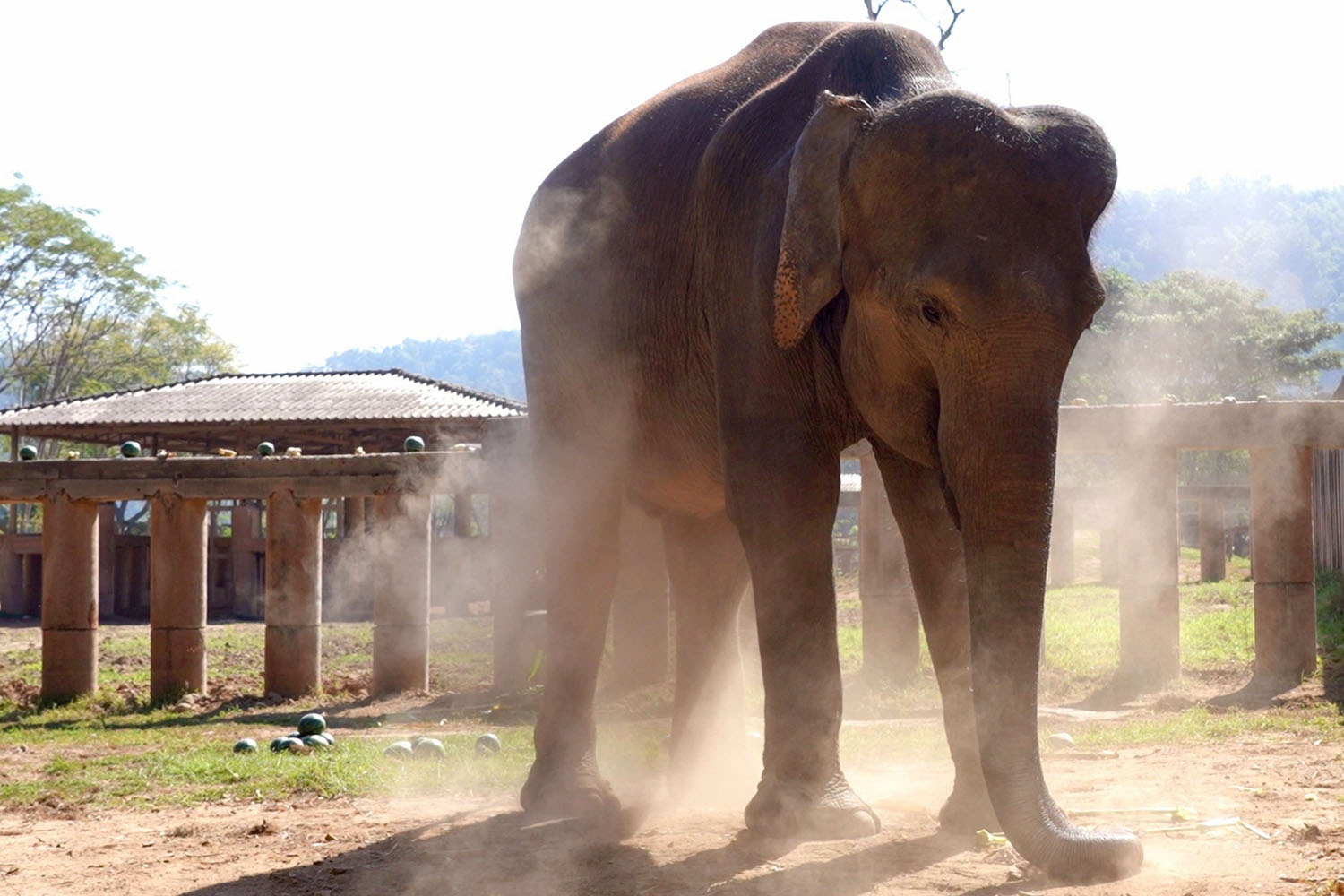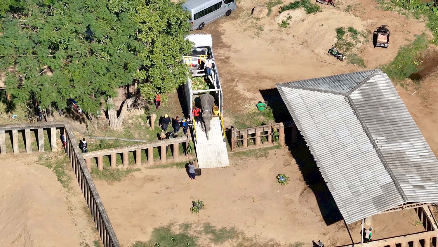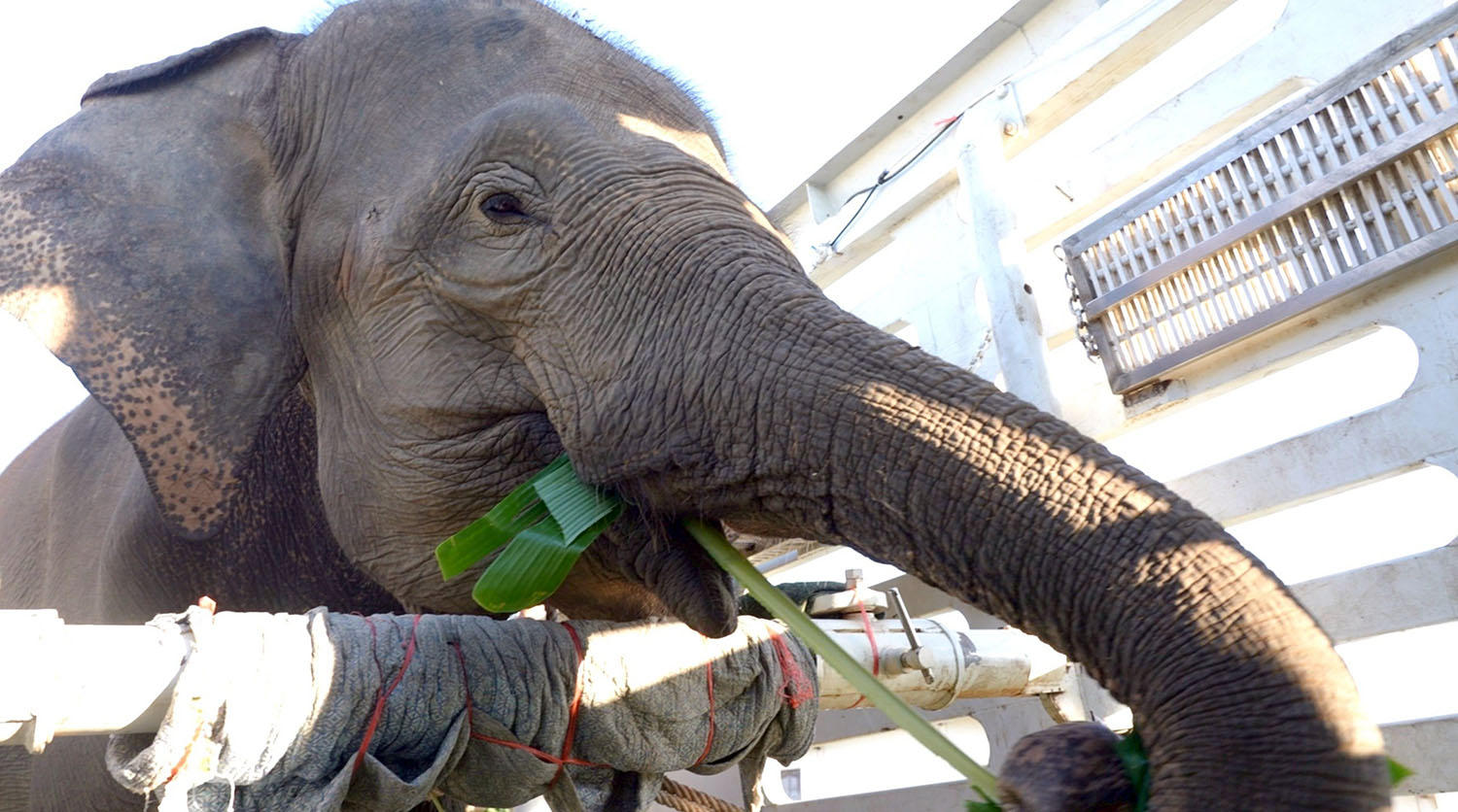 During the long overnight journey from Surin Province to the sanctuary in Mae Taeng, Chiang Mai Province, Nam Phueng was understandably anxious, but she was still able to spray herself with water and eat cucumbers and banana leaves along the way.