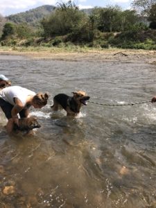 This post should be called, Jo Jo’s Big Day Out. Jo Jo needed a periodic blood test. If you know Jo Jo, you know that this has the potential for all kinds of unpleasant outcomes. A plan was put in place. A large group of volunteers headed down to River House to walk all the dogs, to serve as a decoy for Jo Jo, and also to do some socializing with some new pups living at the house. On the way back from the walk, Jo Jo was at the back of the pack, he was sneakily met with by Ben who quickly took his blood (!), without a hitch. Doggy deception complete. Now, for the reward. It was a very hot day, and right after lunch, so everyone was panting (walkers, included). We headed down to the river for a badly needed dip in the water. It was a beautiful day, still early in the hot season, so the water was still a bit chilly. We returned all the dogs back to the house, tired and cooled off.