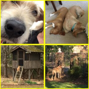 Songkran has fit right in with our 3 other dogs. The other two are older beagles which he does play with but Bradley, a 7 month old hound mix, is his favorite. Songkran is pretty quiet, very cuddly, and always…always!…on the hunt for squirrels and rabbits. There is currently a rabbit den in that walled garden. And squirrels often taunt him (as squirrels are known to do) and run up the fort. Birds are everywhere and drive him nuts! But he has adapted to our schedule so easily. Eating better!! And has filled out a bit. He has a funny routine of wanting to clean his face after each meal…I mean, really rub and scrub it on his blanket (or the rug )…he actually loves it when we wash his face! He has even become protective of us and our dogs- his new pack. When he plays he is absolutely hilarious! Bounces and jumps! We love this big wiry goofball!! We’ve been so lucky that he has been incredibly easy! He runs to give me kisses every morning or every time he comes back inside. We have about an acre yard so he and his buddies have room to play.