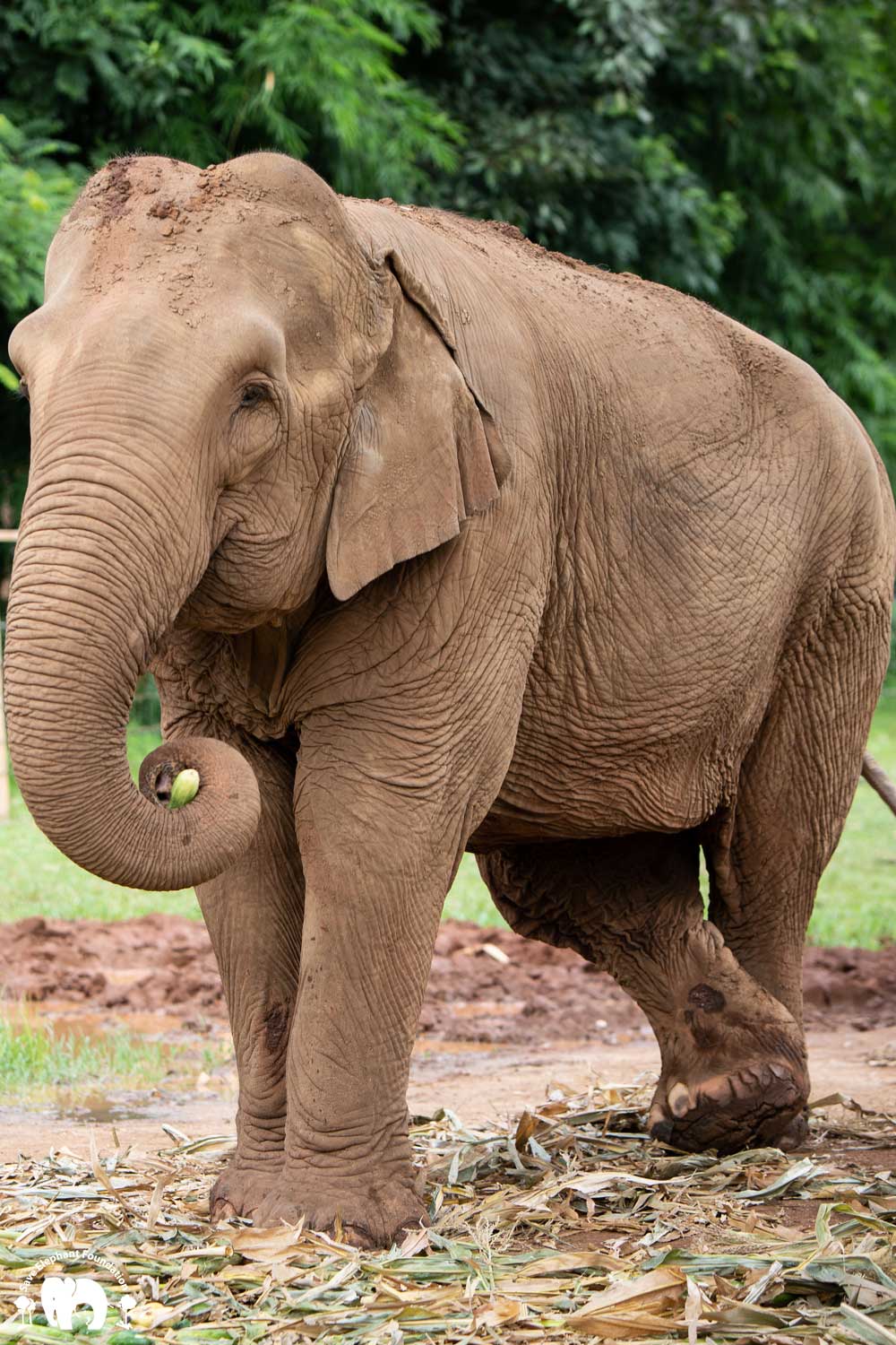 Kanjana had both hind legs injured when she was young. Born captive, her mother worked in a logging camp. After work, the mahout would let the mother and baby out to walk in the jungle. The mother would drag a chain while her baby walked free. During a walk, the young Kanjana fell into a hole after a fire had just burned the forest. Hot coals were still in the hole. She tried to escape, and witnesses say that her mother tried to help but she was not able to get her out until people noticed and helped her. Both back legs were badly burned and her right ankle broken. Even though handicapped, she still spent twenty years pulling logs until she was sold, spending the next 20 years carrying tourists.