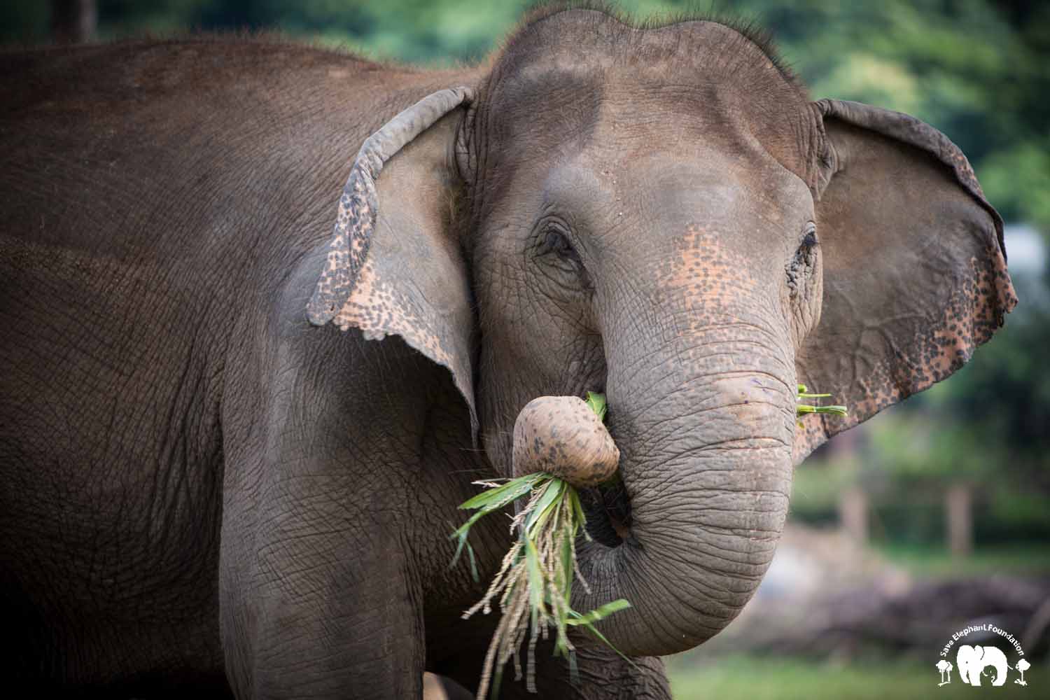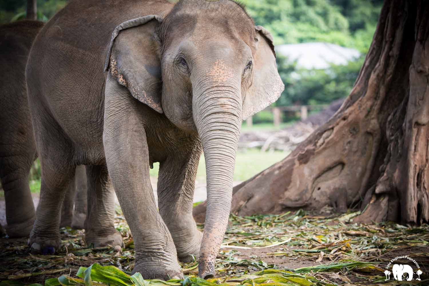 Despite her injury, the previous owner continued to use her to haul logs as well as for forced breeding. Kabu had two babies, neither of which she was allowed to keep for very long. One was a male who died soon after his spirit was broken during phajaan. The other was a female who was sold into the elephant show industry.