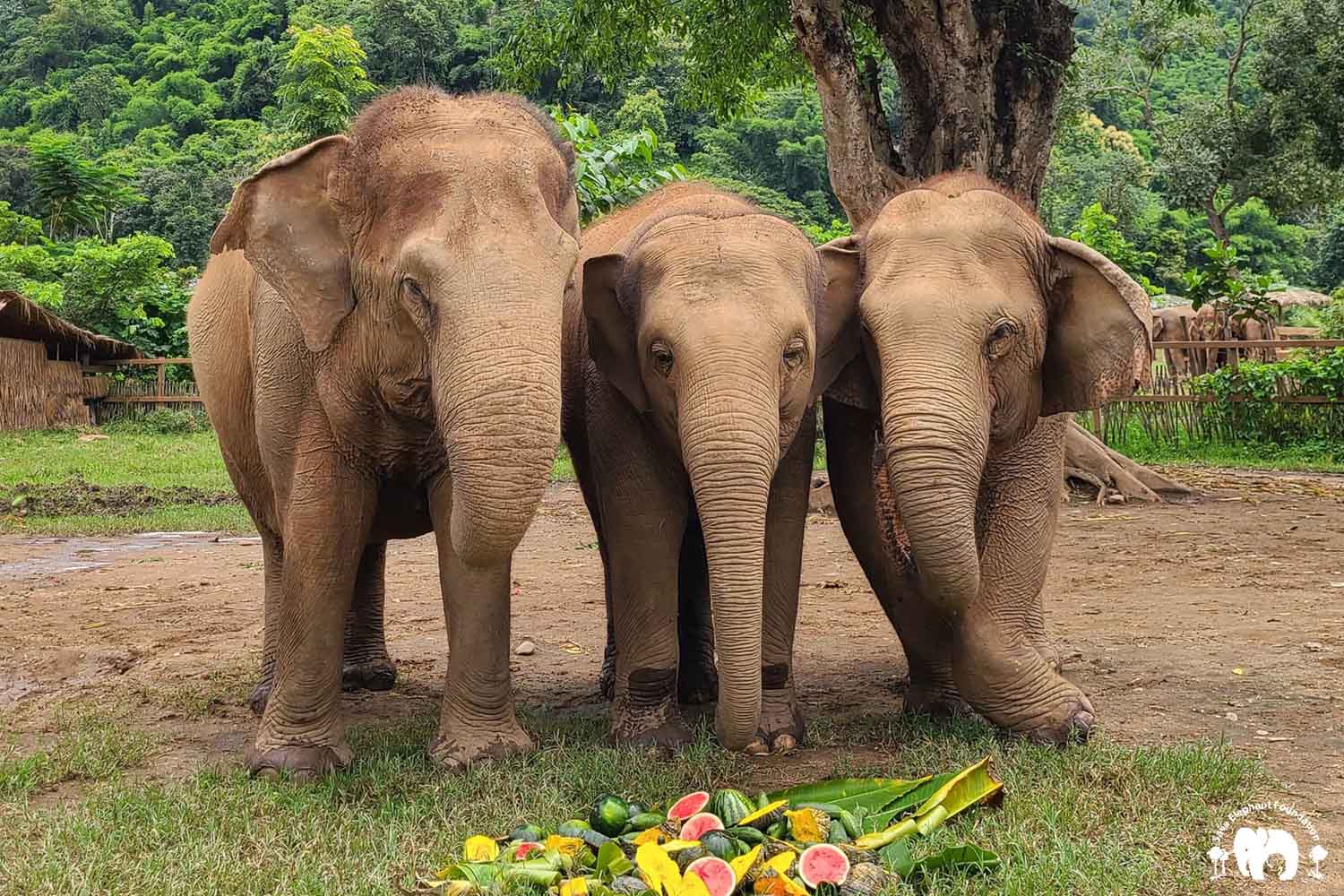 Kabu and Chana are now inseparable and can often be found wallowing in Kabu’s mud pit (territory she had previously been very hesitant to share) or enjoying hydrotherapy in the pool, which offers excellent weightless treatment for their leg injuries. Recently, a blind elephant named Ploy Thong, has become friends with Kabu and Chana and these three elephants now spend all their time together.