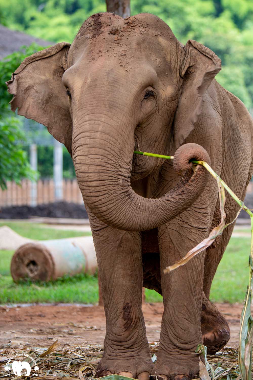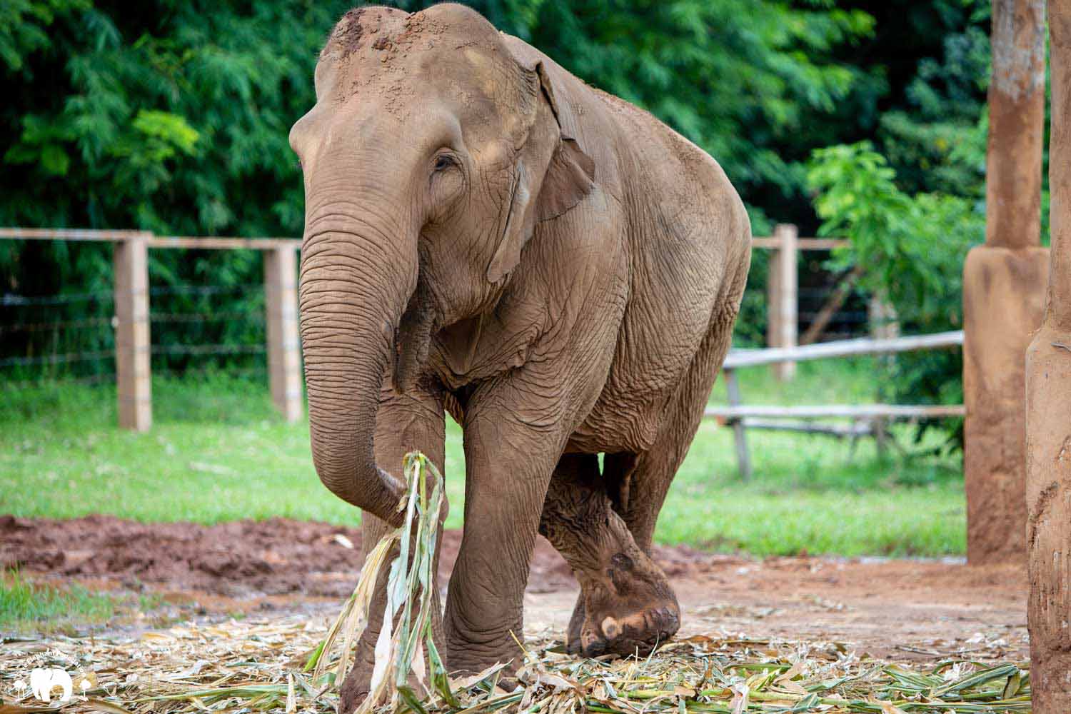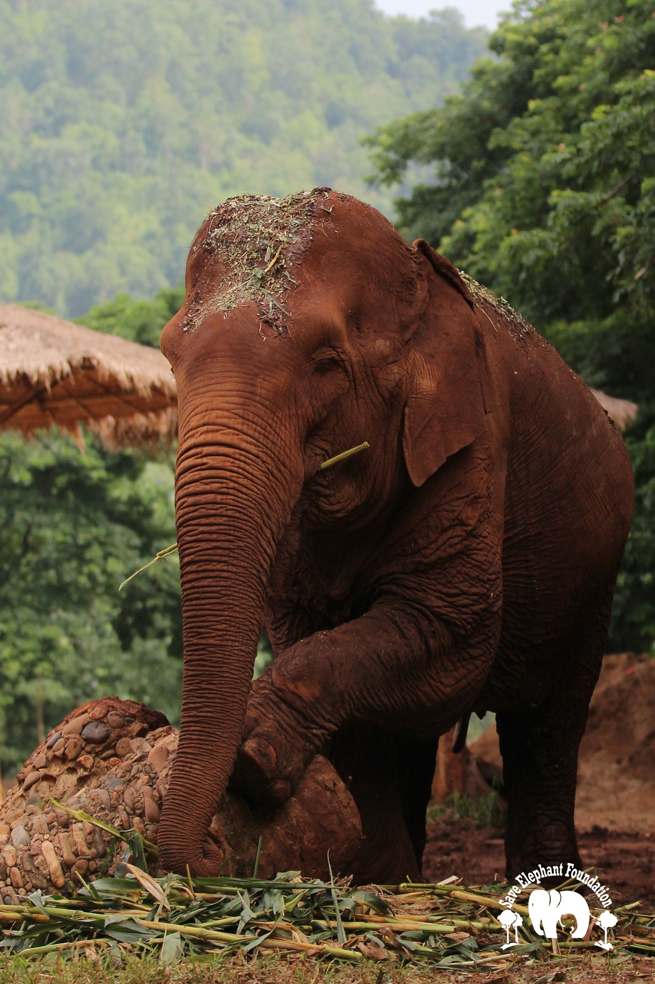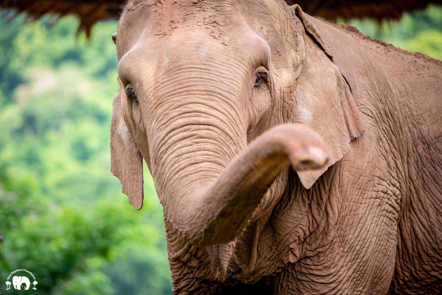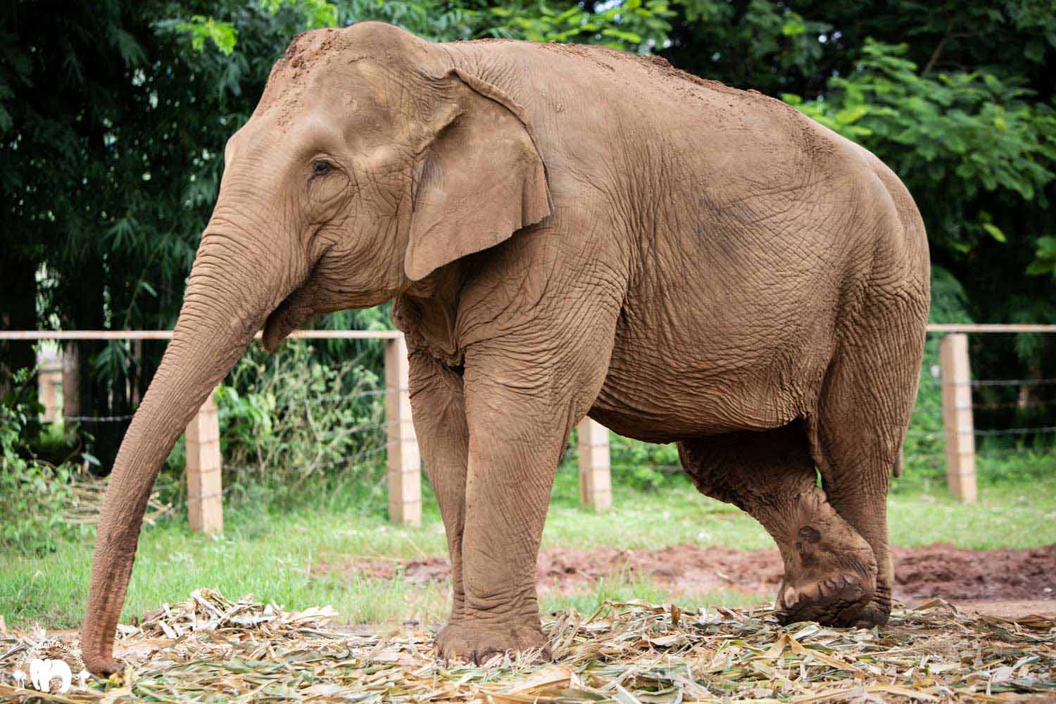 Kanjana had both hind legs injured when she was young. Born captive, her mother worked in a logging camp. After work, the mahout would let the mother and baby out to walk in the jungle. The mother would drag a chain while her baby walked free. During a walk, the young Kanjana fell into a hole after a fire had just burned the forest. Hot coals were still in the hole. She tried to escape, and witnesses say that her mother tried to help but she was not able to get her out until people noticed and helped her. Both back legs were badly burned and her right ankle broken. Even though handicapped, she still spent twenty years pulling logs until she was sold, spending the next 20 years carrying tourists.