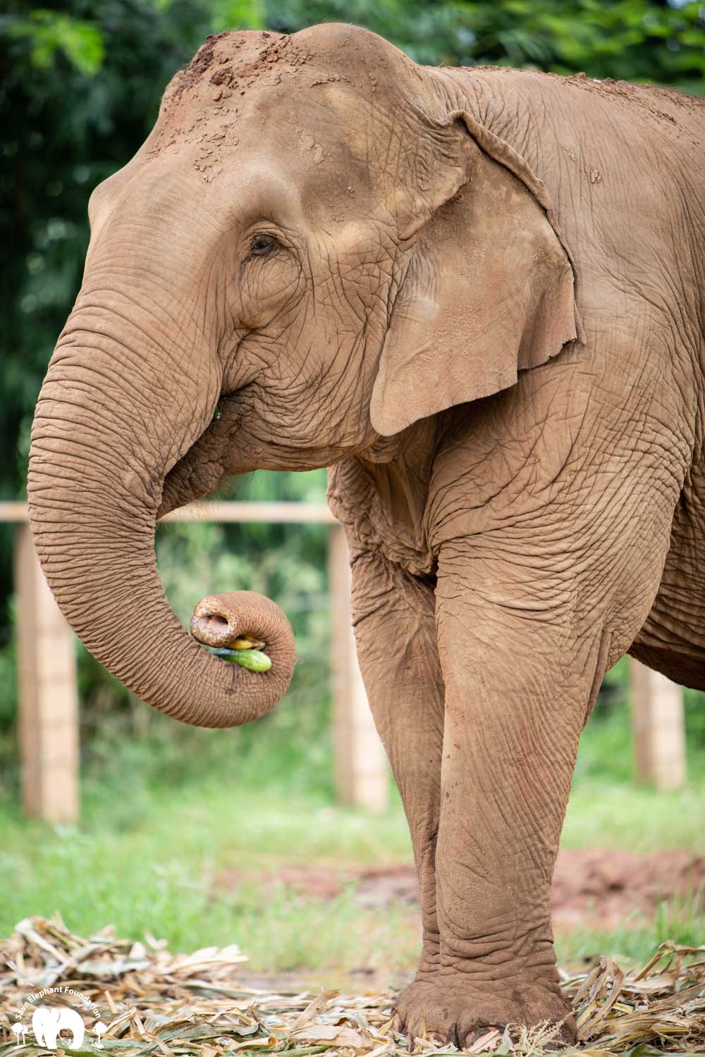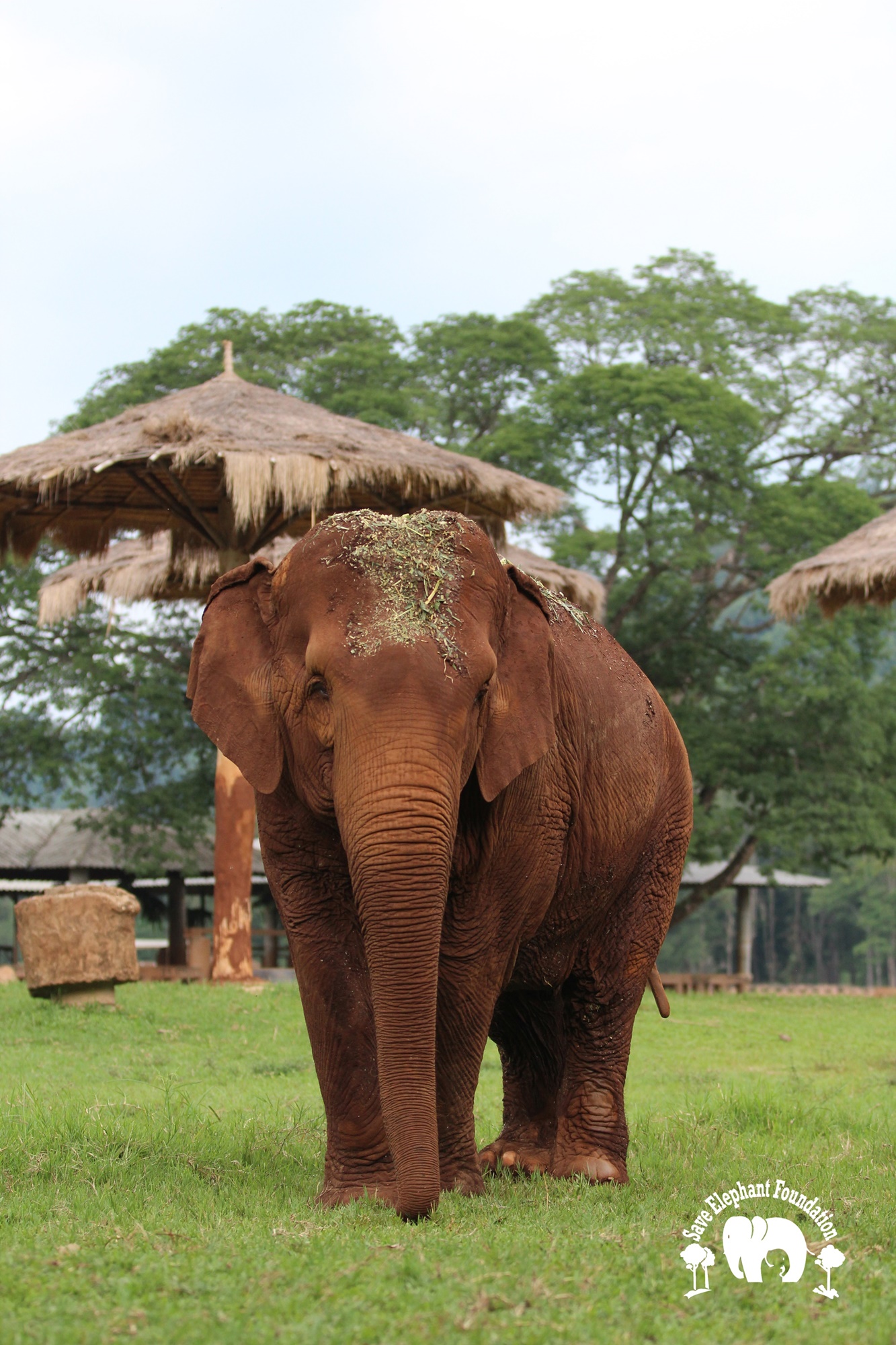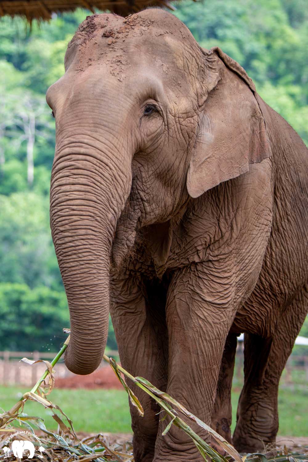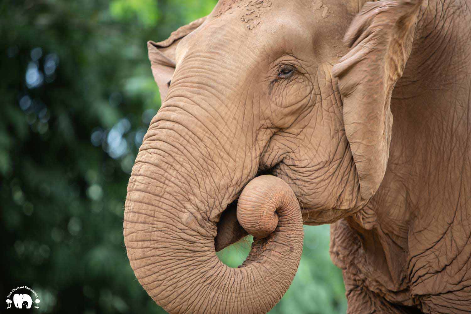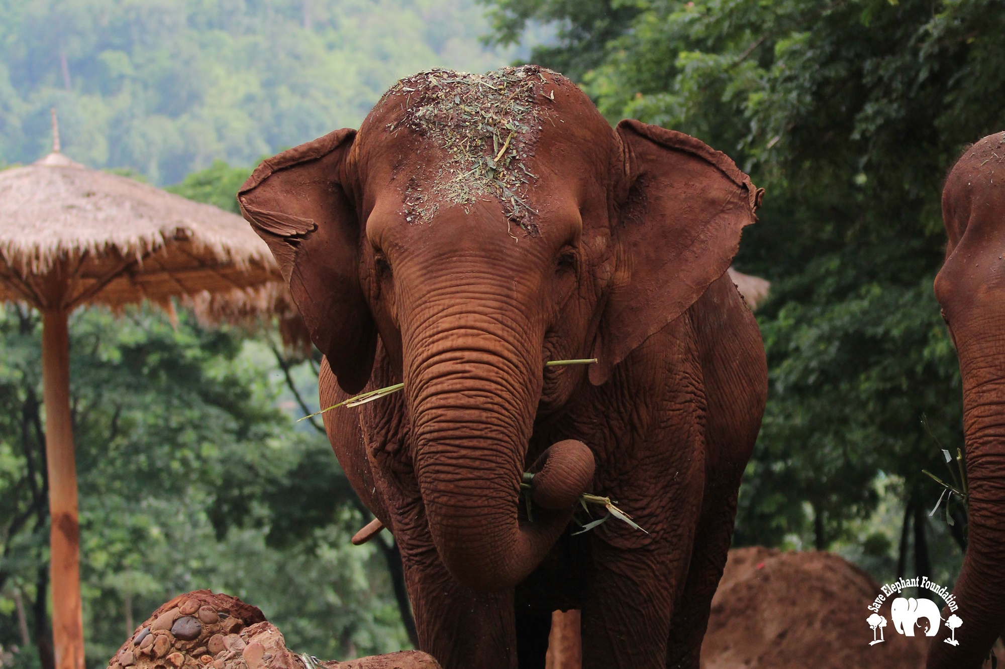 Kanjana had both hind legs injured when she was young. Born captive, her mother worked in a logging camp. After work, the mahout would let the mother and baby out to walk in the jungle. The mother would drag a chain while her baby walked free. During a walk, the young Kanjana fell into a hole after a fire had just burned the forest. Hot coals were still in the hole. She tried to escape, and witnesses say that her mother tried to help but she was not able to get her out until people noticed and helped her. Both back legs were badly burned and her right ankle broken. Even though handicapped, she still spent twenty years pulling logs until she was sold, spending the next 20 years carrying tourists.
