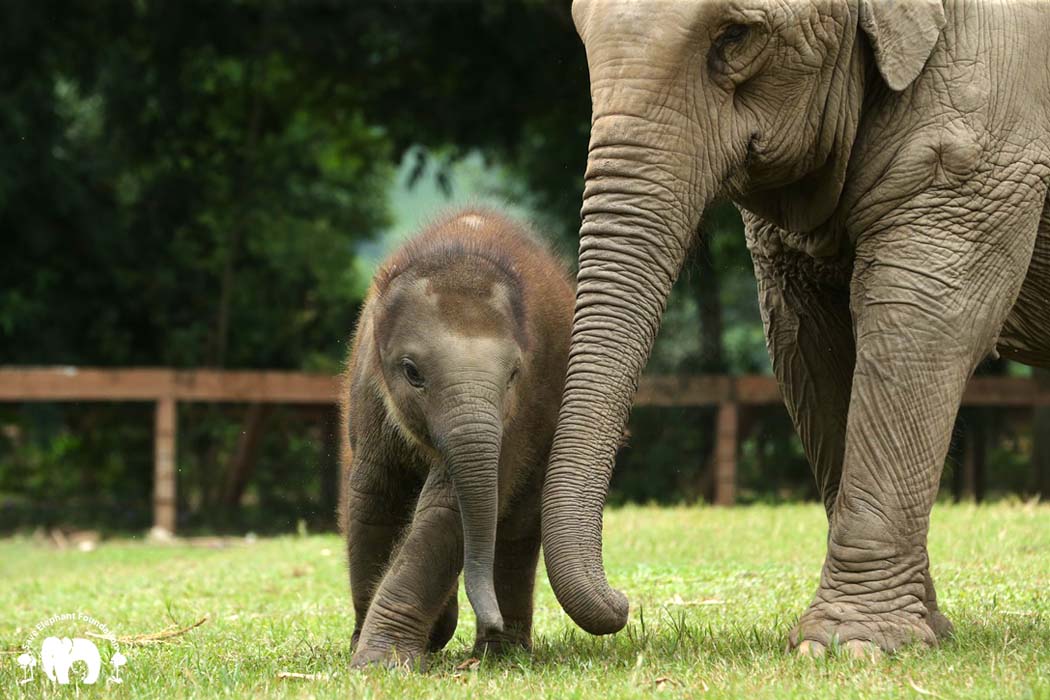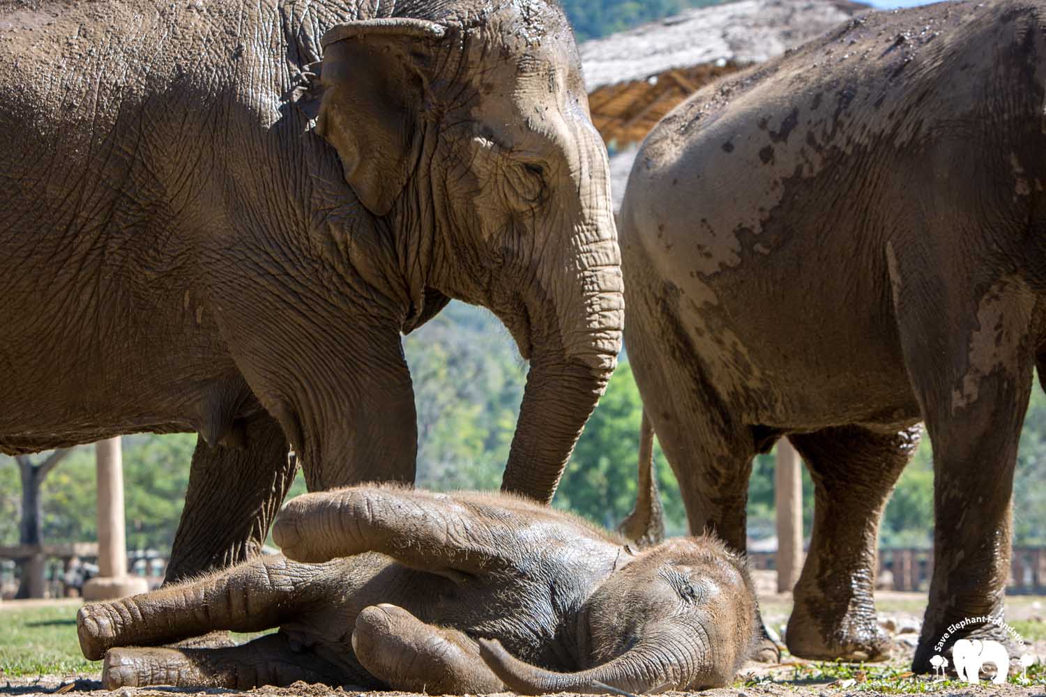After arriving at SEF, many of our resident elephants approached Kham Moon to become the new nanny to her little girl. Eventually, Kham Moon selected Dmax, one of the seven elephants who was rescued last year. Dmax visited this mother and baby elephant regularly and shared meals with them. They slowly became friends and in time Dmax was chosen as Pyi Mai’s new nanny.