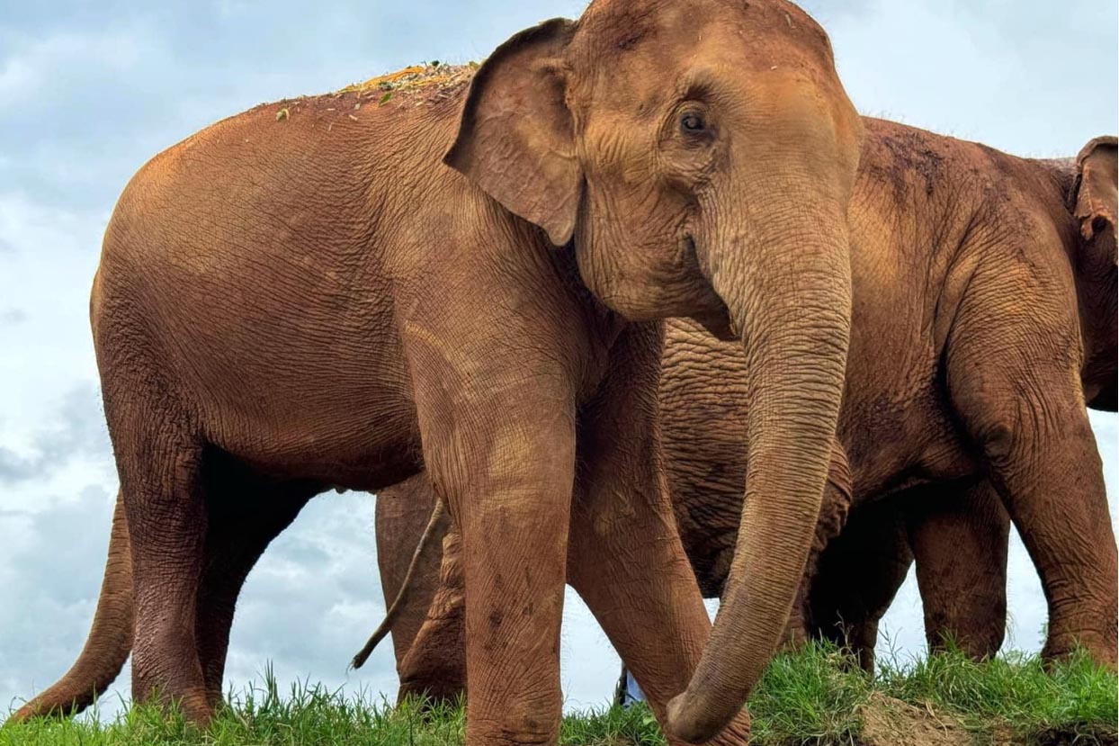 By 13 years old, NamThip’s young body already bore the marks of years of neglect and exploitation. Severely underweight, with a trembling trunk and sunken eyes, her plight gained public attention through a video that reached Saengduean “Lek” Chailert, the founder of Save Elephant Foundation. NamThip was rescued in February 2024 and brought to the park to start a new life in a caring, loving home.